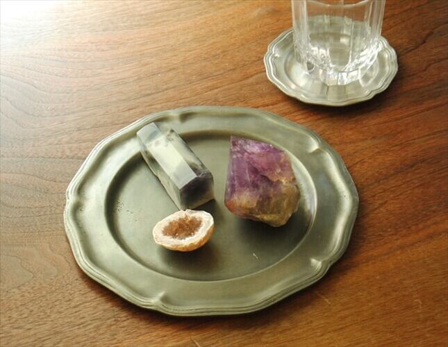 フランス買い付け 大きめ 古い錫のプレート 22.5cm 花形リム トレー コースター ピューター ETAIN アンティーク ig2133