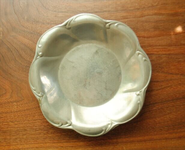 フランス買い付け 大きめ 古い錫の深皿 22cm 花形リム プレート トレー コースター ピューター ETAIN アンティーク ig2134