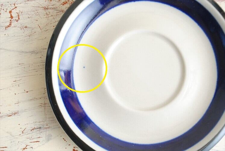 画像のように、ソーサーの白い部分に1mm程の青い釉薬がのっている箇所が見られます。