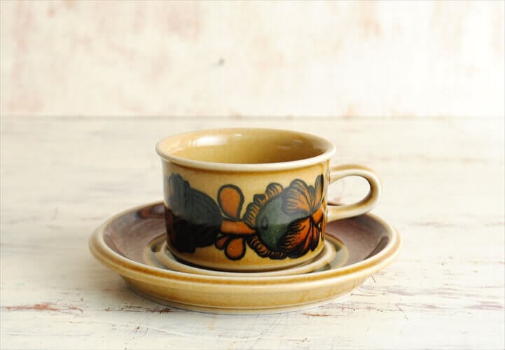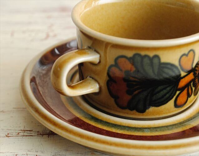 優しい黄褐色のベースに花の絵付けが魅力的なデザインで食洗機対応なのも嬉しいポイントです。