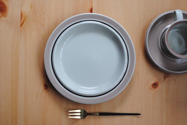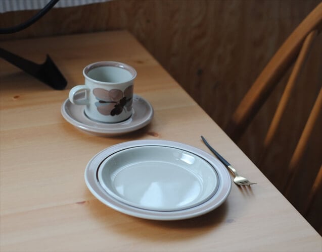 カップ&ソーサーは淡いピンクベージュのような花をRaija Uosikkinen(ライヤ・ウオシッキネン)がぽってりと優しく描いていますが、プレートはラインのみの優しくもシンプルなデザインです。