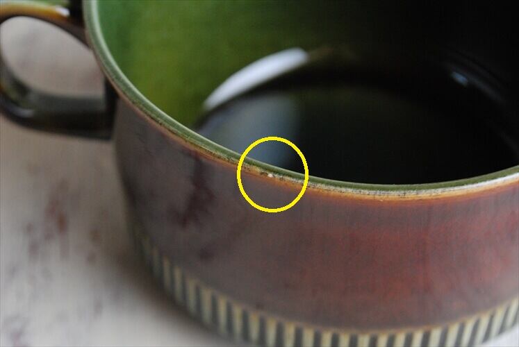 カップ縁に画像のような1mm程のチップのような箇所が見られます。また高台に画像のようなくぼみが見られます。釉薬がのっているので製造時からのものと思われます。